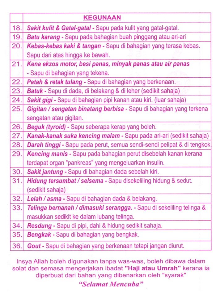 Sapu di bahagian dada dan belakang untuk mengurangkan Lelah dan Asma